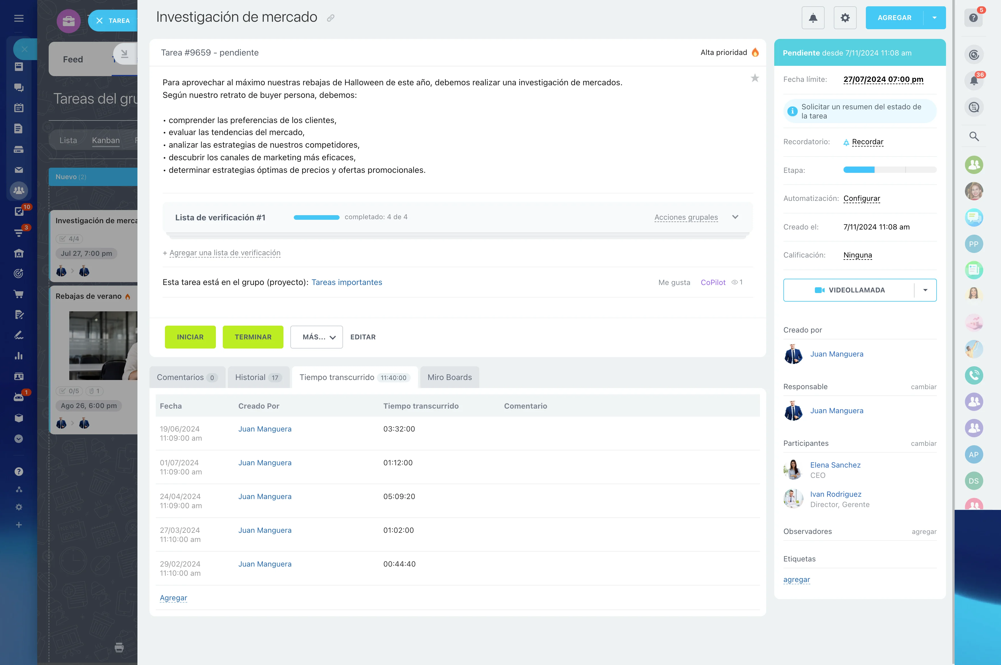 Todos los cambios en el seguimiento de la tarea se reflejan en el historial de la tarea. Ahí podrás ver cuántas veces se pausó una tarea, la duración de las pausas y el ritmo de trabajo general.