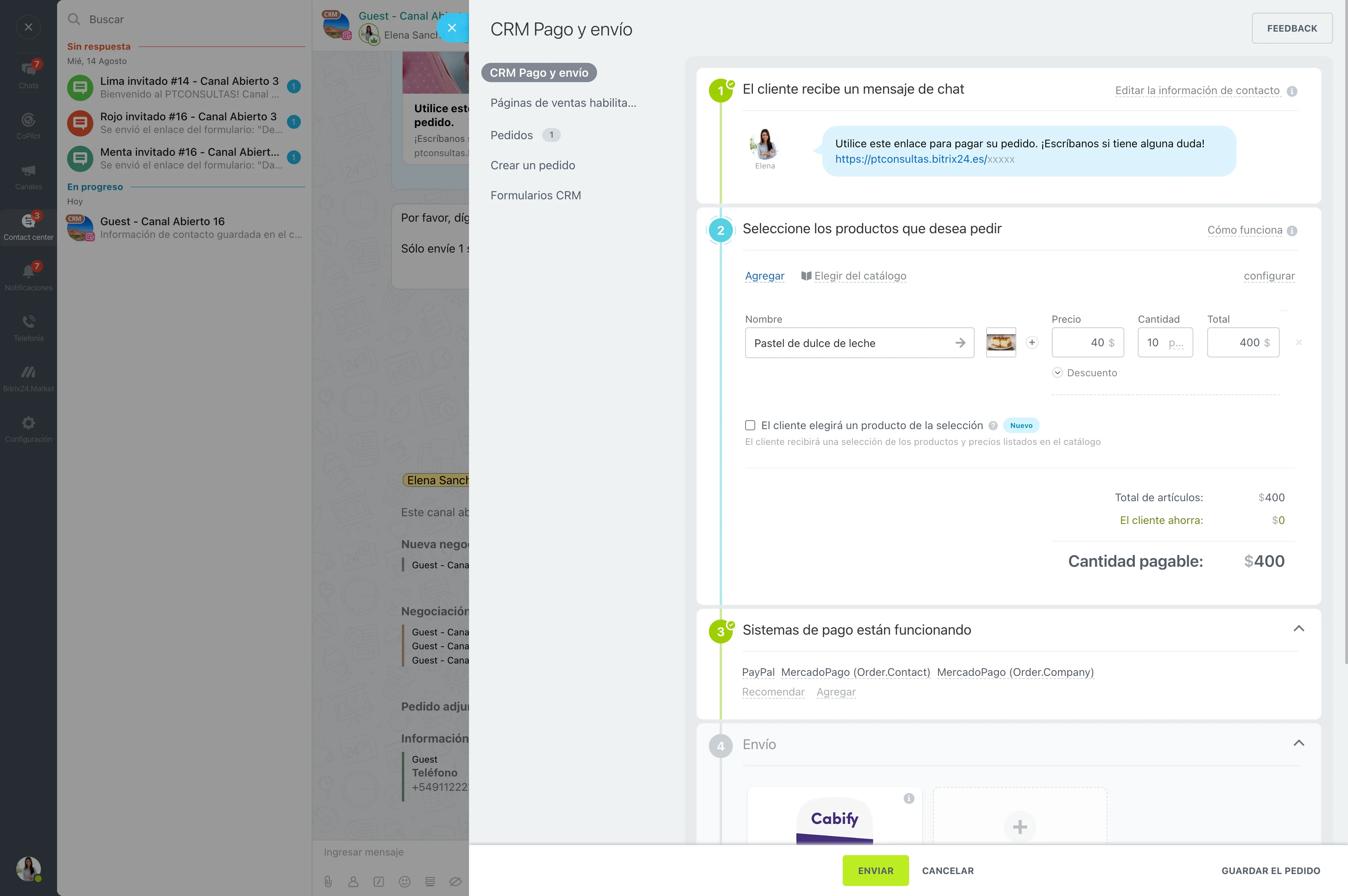 Todos los pedidos y clientes (junto con sus datos de contacto) se agregan automáticamente a tu CRM de Bitrix24.
