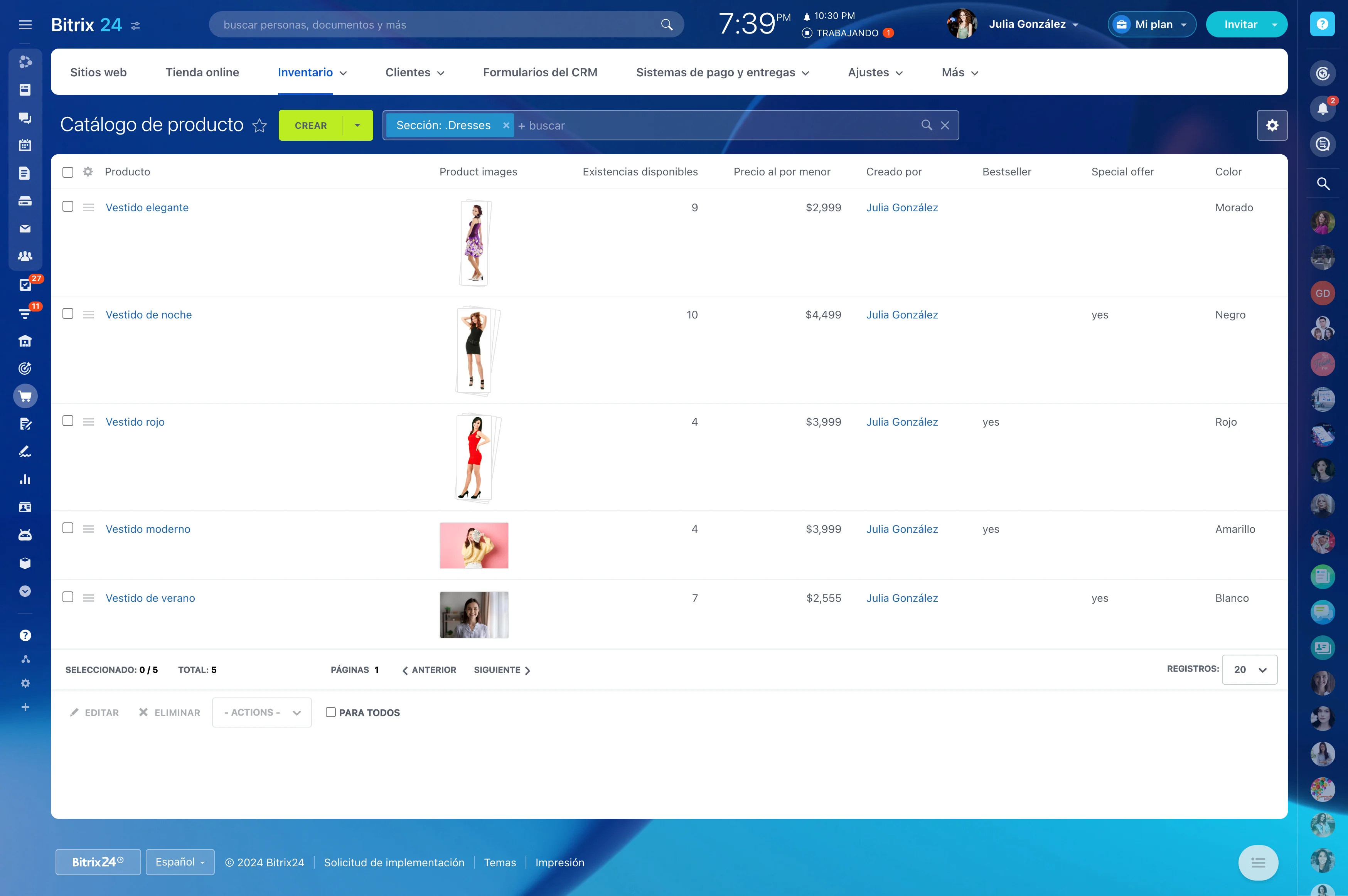 El catálogo de producto en Bitrix24 tiene todo lo que necesites para administrar tus ventas. No dejes que la palabra "producto" te engañe: existe una entidad separada llamada "servicio" que puedes usar (si tu negocio es de servicios).
